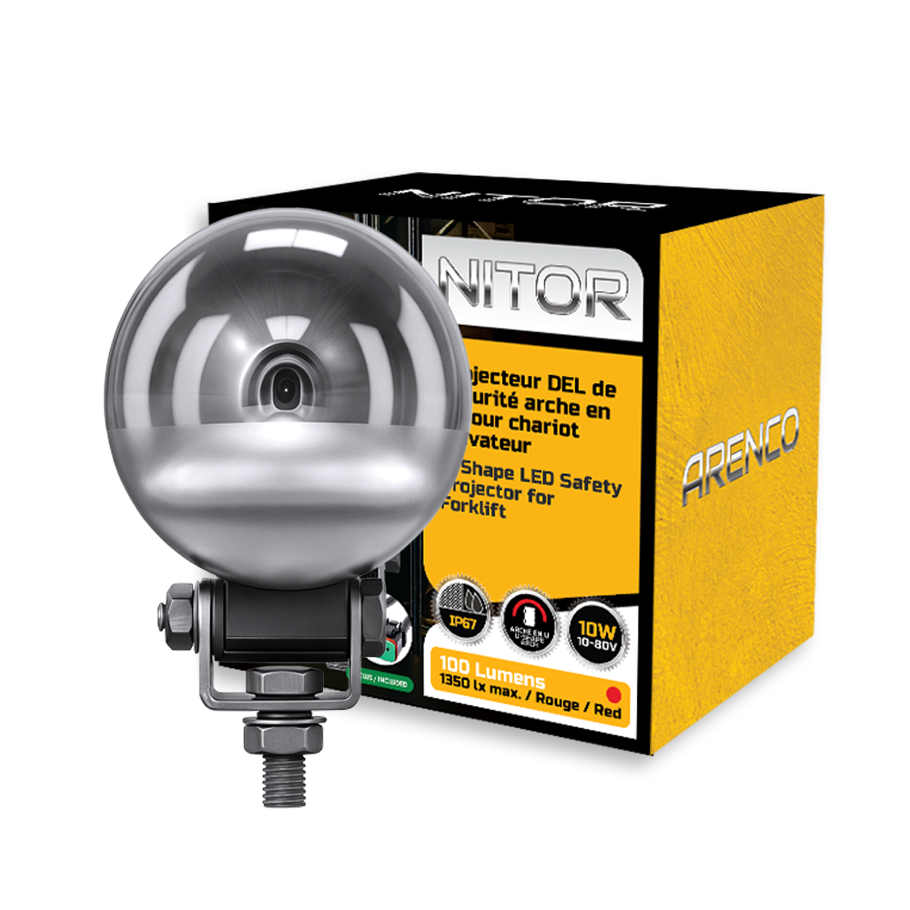 Projecteur à DEL formant un faisceau en arche en U rouge au sol pour délimiter la zone de sécurité du chariot élévateur.
